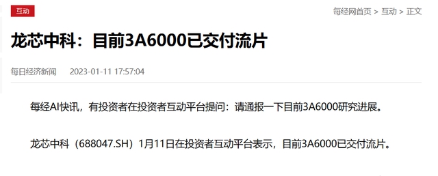 近日,在投資者互動平臺上,有人咨詢關于3A6000芯片的研究進展問題,龍芯中科回復表示:目前3A6000已交付流片。這說明,國內下一代CPU首款芯片,基于自主化設計,目前已經完成了研發(fā)。